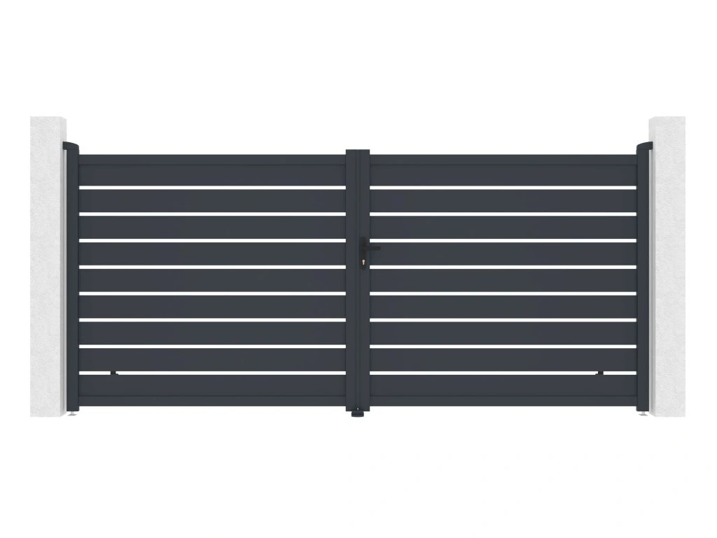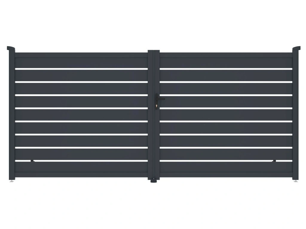Výplň s horizontálně uloženými lamelami v atraktivním grafitovém provedení kombinuje dostatek soukromí s moderním designem, takže brána s otevíráním dovnitř bude slušet každému typu oplocené stavby.
