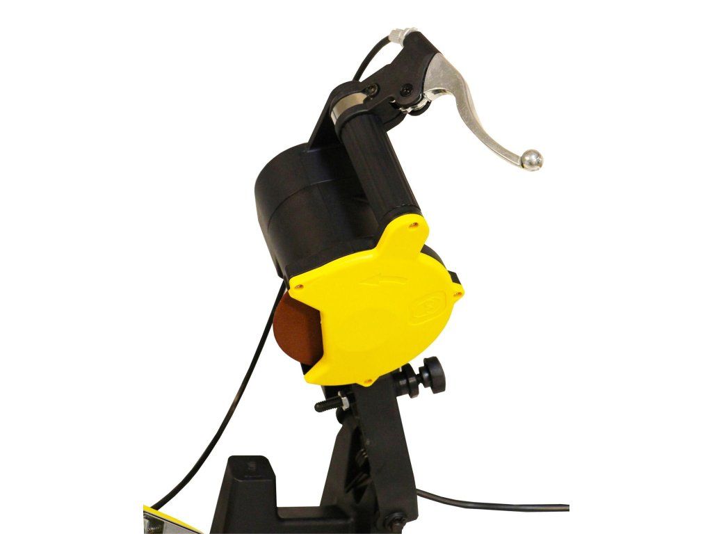 Bruska pilových řetězů 85 W disponuje možností trvalého upnutí k pracovnímu stolu za pomocí 2 montážních otvorů v podstavci, což umožňuje nejen pohodlné, ale hlavně bezpečné broušení pomocí brusky pilových řetězů. Bruska pilových řetězů 85 W disponuje možností rychlé a pohodlné aretace pomocí pákové brzdy.