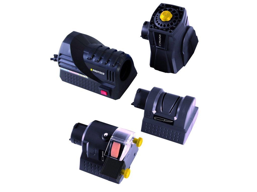 Univerzální bruska 3v1 k broušení drobných nástrojů (nůžek, dlát, šroubováků atd.) pro ostření nožů, vrtáků s min. průměrem 3 mm a maximálním průměrem 10 mm. Adaptéry mají bajonetové upínání, což usnadňuje jejich výměnu. Stačí pouze nasadit a pootočit. Adaptér na ostření nožů je osazen kotouči s diamantovým povlakem.