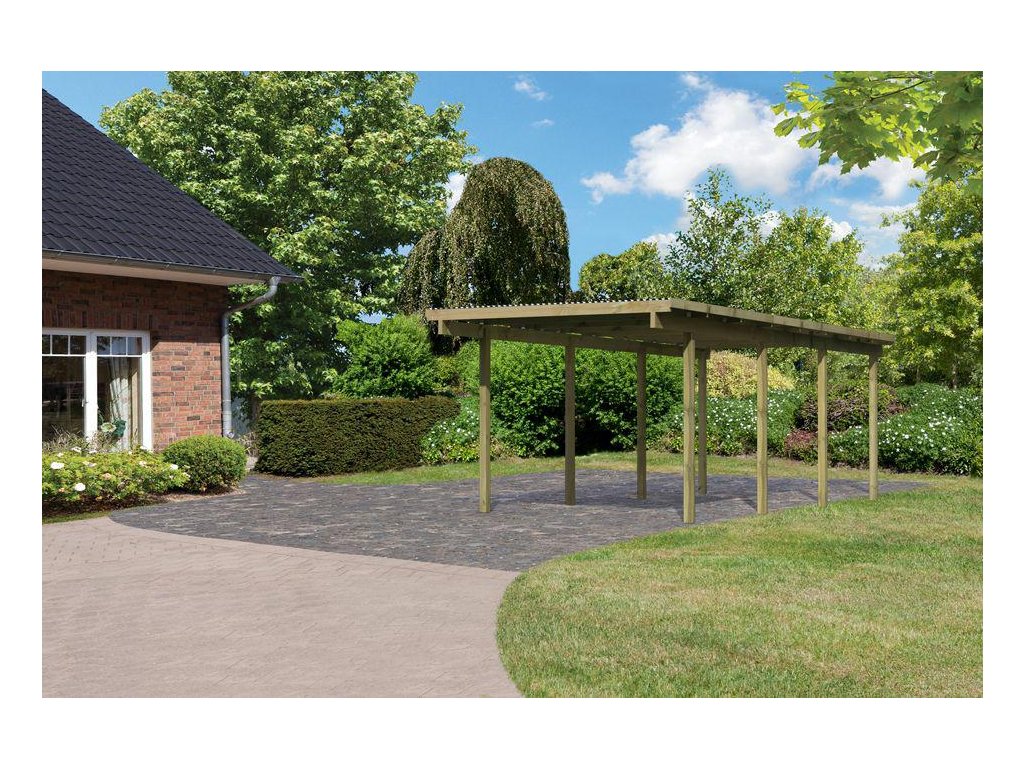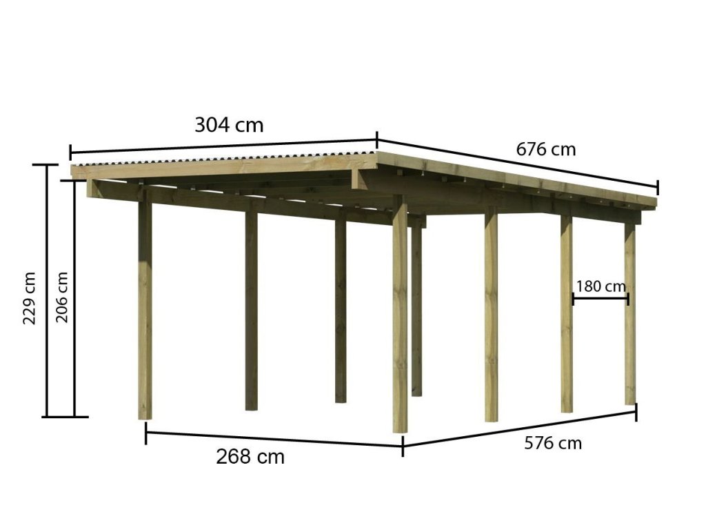 Přístřešek na auto - obdélníkový tvar a svými rozměry vyhovuje většině modelů vozidel běžných na českém trhu. Celková zastřešená plocha je 3,04 x 6,76 m. Průjezdná výška je 206 cm. Střechu podpírá osm dřevěných sloupků 9 x 9 cm. Konstrukce přístřešku je tlakově impregnována a je tak dobře chráněna proti dřevokazným houbám i hmyzu, ale i proti nepříznivým povětrnostním podmínkám. Impregnace je zdravotně nezávadná a naprosto bezpečná. Vzhledem k velkým plochám střechy a zatížení větrem je nutné připevnit přístřešek k zemi pomocí odpovídajících zemních kotev (nejsou obsahem dodávky - lze dokoupit jako příplatkové příslušenství).