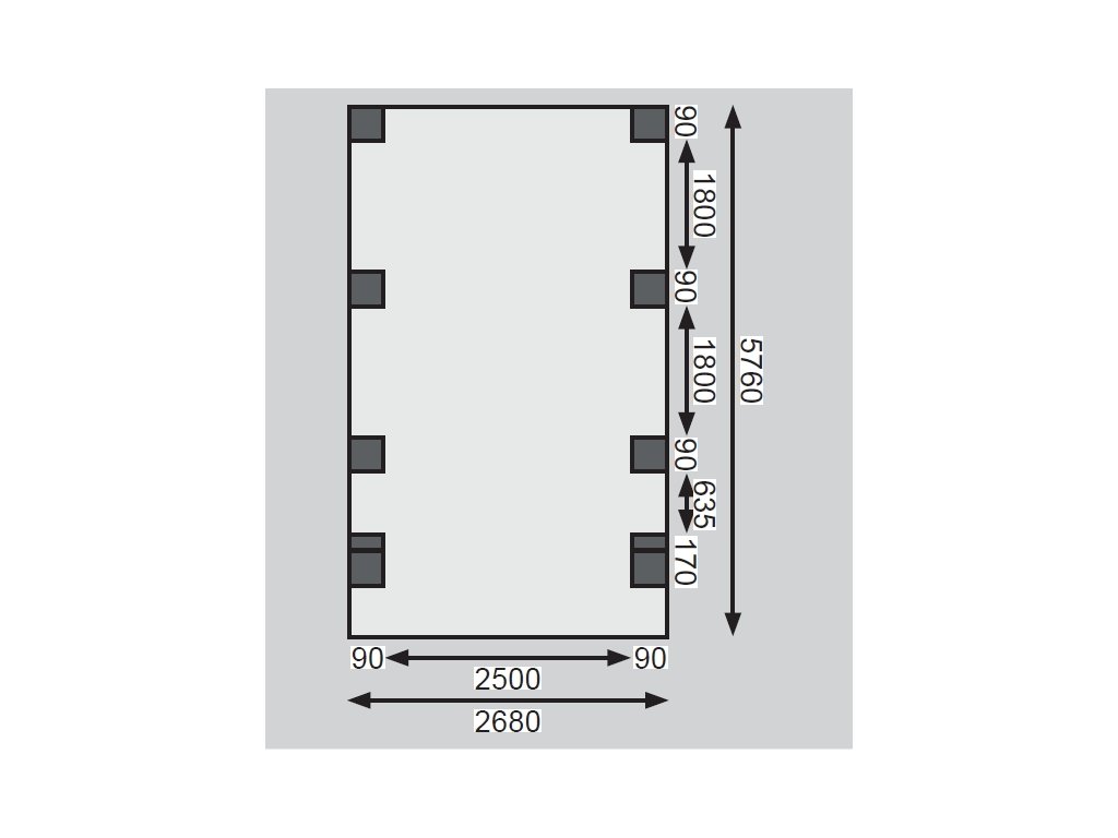 Přístřešek na auto - obdélníkový tvar a svými rozměry vyhovuje většině modelů vozidel běžných na českém trhu. Celková zastřešená plocha je 3,04 x 6,76 m. Průjezdná výška je 206 cm. Střechu podpírá osm dřevěných sloupků 9 x 9 cm. Konstrukce přístřešku je tlakově impregnována a je tak dobře chráněna proti dřevokazným houbám i hmyzu, ale i proti nepříznivým povětrnostním podmínkám. Impregnace je zdravotně nezávadná a naprosto bezpečná. Vzhledem k velkým plochám střechy a zatížení větrem je nutné připevnit přístřešek k zemi pomocí odpovídajících zemních kotev (nejsou obsahem dodávky - lze dokoupit jako příplatkové příslušenství).