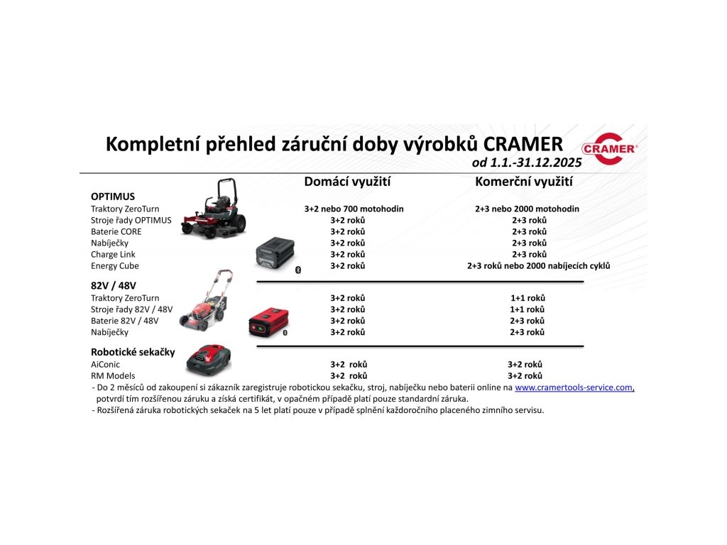 - Pro komerční použití standardně 2 roky, při registraci 5 let nebo 2000 nabíjecích cyklů (co nastane dříve).