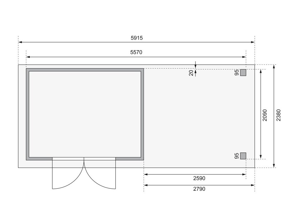 Tato verze domku obsahuje i přístavek včetně zadní a boční stěny délky 280 cm.