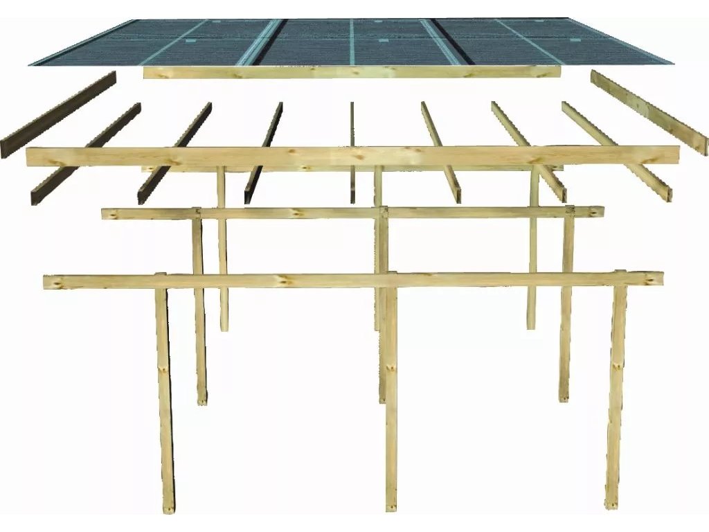 Přístřešek má obdélníkový tvar a svými rozměry vyhovuje většině modelů vozidel běžných na českém trhu. Celková zastřešená plocha je 5,63 x 6,76 m. Průjezdná výška je 206 cm. Střechu podpírá dvanáct dřevěných sloupků 9 x 9 cm. Konstrukce přístřešku je tlakově impregnována a je tak dobře chráněna proti dřevokazným houbám i hmyzu, ale i proti nepříznivým povětrnostním podmínkám. Impregnace je zdravotně nezávadná a naprosto bezpečná. Vzhledem k velkým plochám střechy a zatížení větrem je nutné připevnit přístřešek k zemi pomocí odpovídajících zemních kotev (nejsou obsahem dodávky - lze dokoupit jako příplatkové příslušenství).