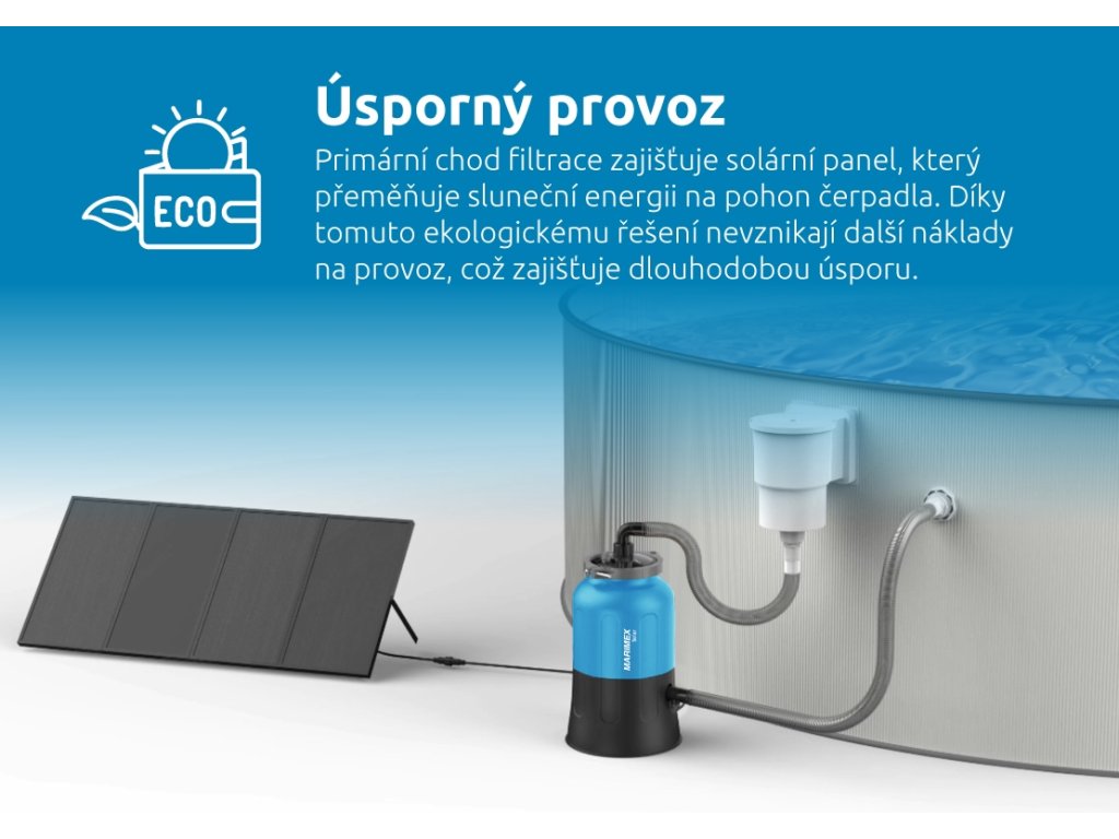 Úsporný provozPrimární chod filtrace zajišťuje solární panel, který přeměňuje sluneční energii na pohon čerpadla. Díky tomuto ekologickému řešení nevznikají další náklady na provoz, což zajišťuje dlouhodobou úsporu. |