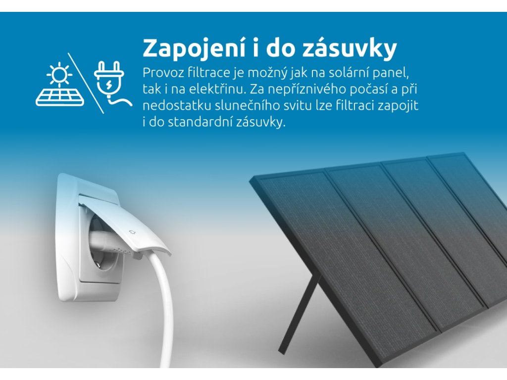 Zapojení i do zásuvkyProvoz filtrace je možný jak na solární panel, tak i na elektřinu. Za nepříznivého počasí a při nedostatku slunečního svitu lze filtraci zapojit i do standardní zásuvky. |