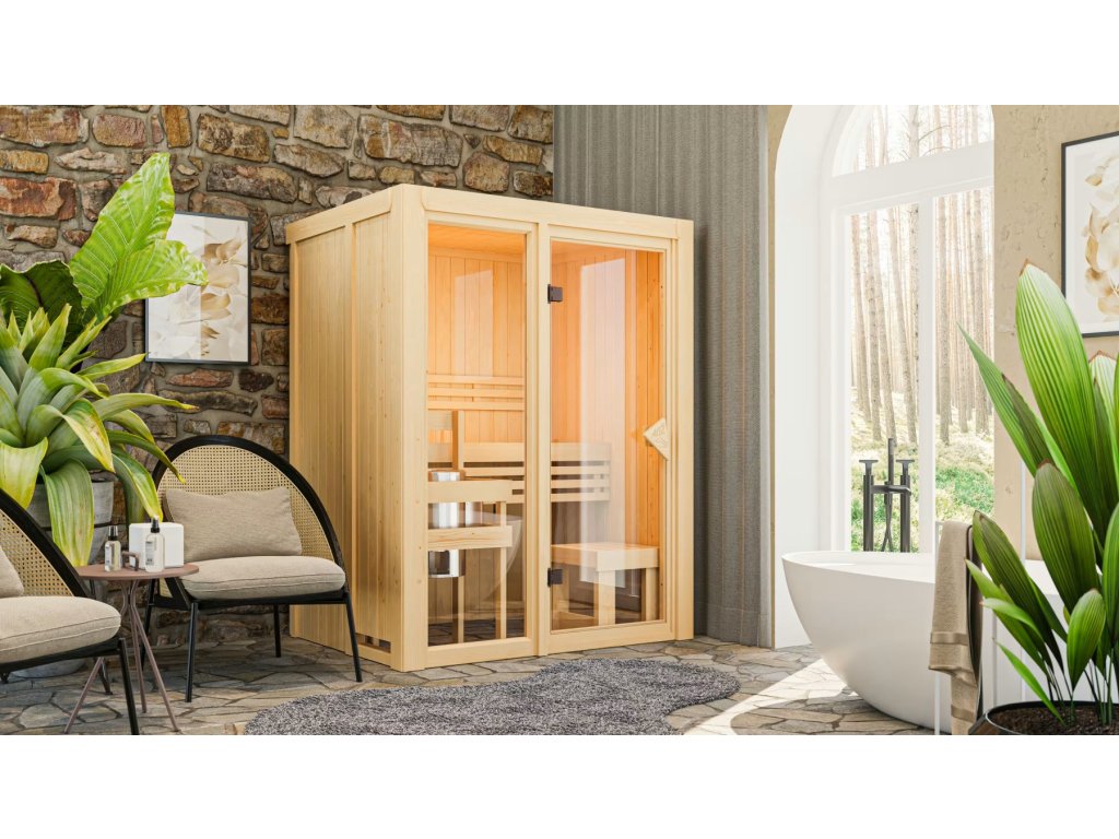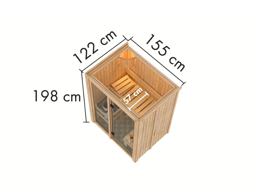 Finská sauna určená pro dvě osoby v sedě. Má obdélníkový tvar o rozměrech š 155 x h 122 x v 198 cm. Tento model finské sauny je určený do temperovaných interiérů domu nebo bytu. Její výrobce, firma KARIBU HOLZTECHNIK z německých Brém, dokázala svými výrobky úspěšně navázat na staletou tradici skandinávského saunování a současně do ní zapracovat dnešní moderní technologie. Sauna je celá vyrobena ze dřeva severského smrku v přírodním provedení. Dřevo pochází ze vzdáleného severu Evropy a je chemicky naprosto neošetřené (není ani namořeno, ani nalakováno). V důsledku toho je prosté všech známých problematických látek, které by se v průběhu saunování mohly ze dřeva uvolňovat. Tato interiérová sauna vykazuje mimořádné tepelně-izolační vlastnosti. Stěny sauny jsou složeny z vnitřní a vnější vrstvy speciálně hlazených prken s perem a drážkou, mezi kterými je 42 mm silná tepelná izolace v podobě minerální vlny. Celková síla stěny je tak 68 mm. Zadní nebo boční nepohledové strany orientované ke stěně místnosti mají vnější stranu ze sololitu. Proto jsou při stejné tepelné izolaci o cca 10 mm tenčí než pohledové strany pokryté palubkami.