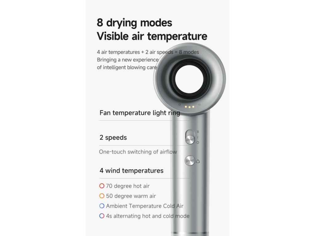 - Super rychlost vzduchu díky výkonnému střídavému motoru s otáčkami 110 000 za minutu poskytuje fén rychlé a efektivní sušení.