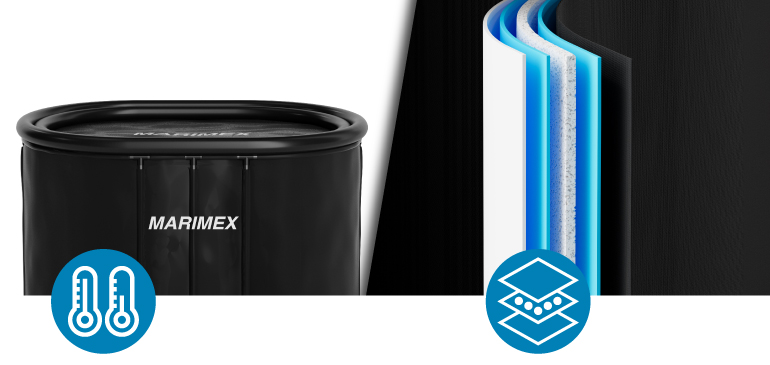 Ochlazovací káď je vyrobena z pečlivě vybraných materiálů, které zajišťují dlouhou životnost a vysoký komfort při používání. Dvě vrstvy PVC zabraňují navlhnutí a zlepšují termoizolační funkci česané bavlny, která udržuje požadovanou teplotu a brání tepelným ztrátám. Voděodolný plášť eliminuje prosakování vody do dalších vrstev, což umožňuje bezproblémové využití za všech podmínek.