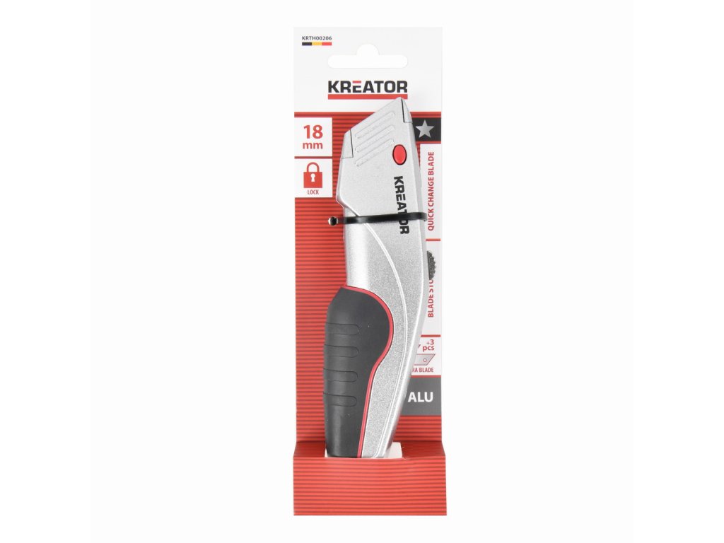 S tímto robustním nožem KRTH00202 od Kreator ze slitiny zinku snadno řežete koberce, vinyl, střešní krytinu, obaly a další materiály. Rovné čepele lze snadno vyměnit díky praktickému rychloupínacímu systému. Čepel můžete zaaretovat pomocí zajišťovacího mechanismu.