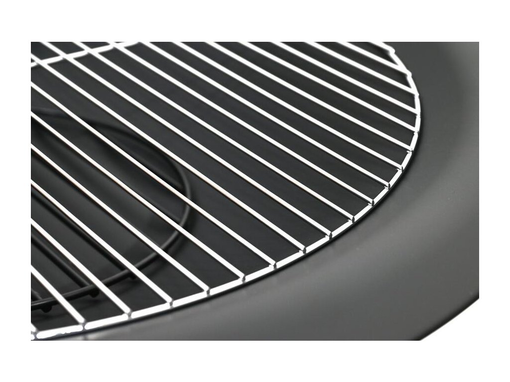 Ohniště je vyrobeno z kvalitní oceli s vysokoteplotním černým nátěrem a disponuje dvouprstencovou konstrukcí, která zajišťuje vysokou stabilitu při používání. Nerezový rošt s průměrem 60 cm je ideální pro grilování masa, zeleniny i dalších pokrmů. Speciálně tvarovaný poklop s pletivem slouží jako ochrana proti jiskrám a výrazně zvyšuje bezpečnost i komfort při posezení u ohně. Ve spodní části se nachází ocelová mřížka se smaltovanou povrchovou úpravou, která slouží k zachycení popela. Součástí balení je také kovový pohrabáč, který usnadňuje manipulaci s ohněm i sejmutí poklopu.