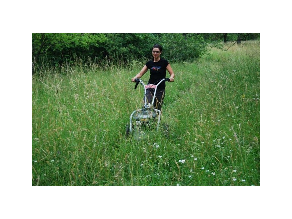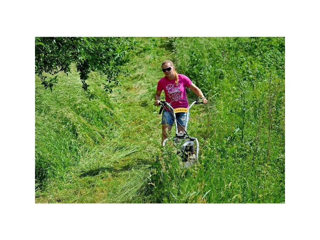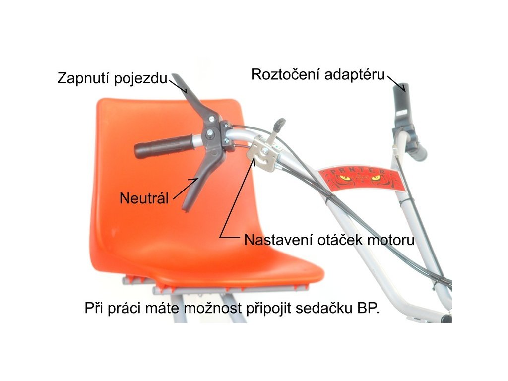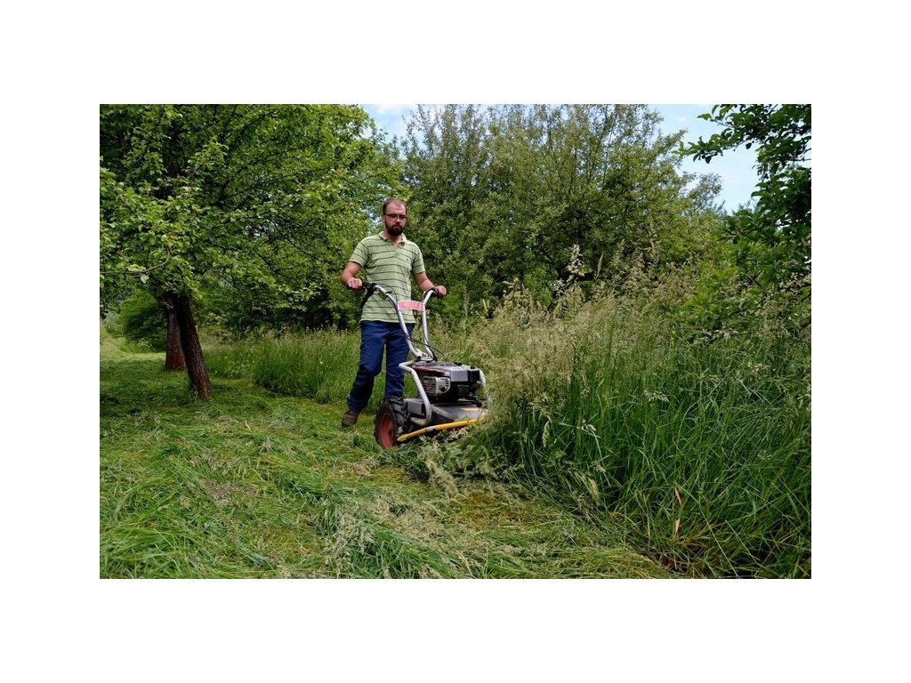 Třírychlostní stavebnicová sekačka s nastavitelnou výškou sečení a možností přestavby na 17 různých pracovních strojů. Pohon na nápravu je řešen řetězem a stroj umožňuje pohodlnou práci i vsedě díky přípojné sedačce.