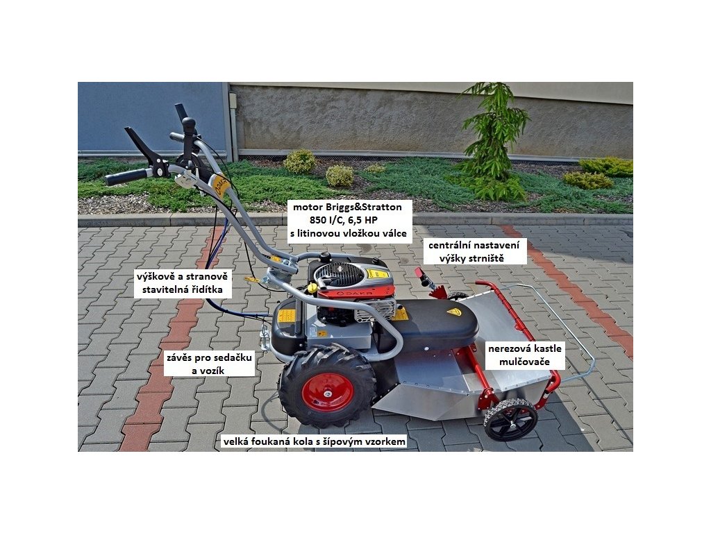 Nastavování výšky strniště je centrální. Mulčovací ústrojí je tvořeno speciálním nožem otáčejícím se v horizontální rovině uvnitř nerezové kastle. Možnost připojit sedačku a při práci sedět, řada adaptérů pro přestavbu na bubnovou či diskovou, obraceč a shrabovač, frézu a radlici na sníh, vozík, zametací kartáč, rotavátor a drtič větví.