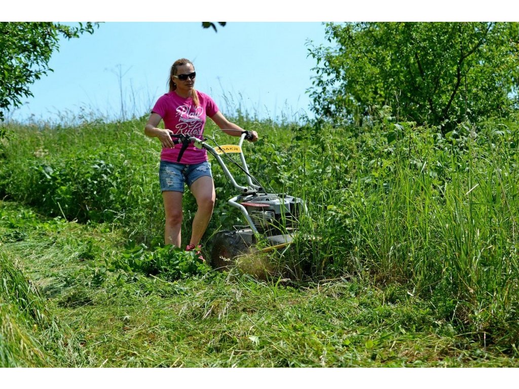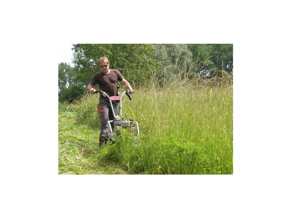 Stavebnicová bubnová sekačka s hydrostatickou převodovkou a plynulou změnou rychlosti vpřed i vzad. Osazena spolehlivým motorem Kohler s objemem 224 ccm, tlakovaným mazáním, olejovou filtrací a litinovým válcem. Náprava s diferenciálem a automatickou uzávěrkou zjednodušuje práci při objíždění překážek, přejíždění po pevném povrchu i manévrování v členitém terénu. Při práci lze pohodlně sedět na připojitelné sedačce.
