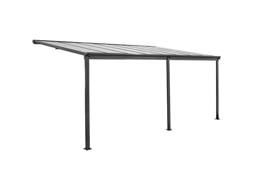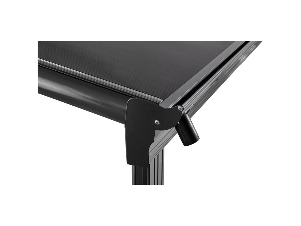 Střecha je osazena 6mm dvoukomůrkovým polykarbonátem v šedém odstínu, který je vybaven UV ochranou. Propouští dostatek přirozeného světla, ale zároveň účinně chrání před deštěm, slunečním zářením i nepříznivým počasím. Barevné provedení střechy harmonicky ladí s antracitovou konstrukcí a vytváří moderní a elegantní celek. Pro zvýšení odolnosti je pergola vybavena také dodatečným střešním vyztužením, které přispívá k vyšší pevnosti při zatížení větrem či sněhem.