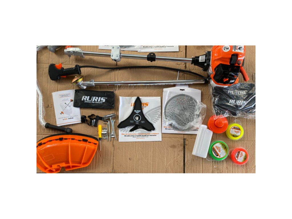 | Příslušenství ve výbavě: | 3-zubý nůž, 80-zubý vidiový kotouč, žací hlava, popruh, 3x 15m balení struny, nádoba na míchání benzínu a oleje, sada nářadí |