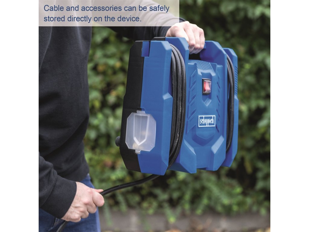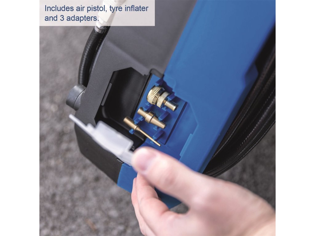 Kompresor je vybavený nejmodernějším motorem s bezolejovou technologií. Kontrola oleje, jeho doplňování nebo výměna tak vůbec není potřeba a kompresor je vždy připravený odvést svoji práci. Jeho kompaktní rozměry a váha pouhých 5 kg ho rovněž předurčují k využití při stanování, kempování a jiných outdoorových aktivitách. Integrované madlo pak usnadňuje přenášení. Praktické uložení kabelu i příslušenství přímo na těle kompresoru znamená, že máte vše vždy po ruce. Velký pracovní dosah poskytuje 4 m tlaková hadice a 4 m přívodní kabel, takže se pohodlně dostanete i k hůře přístupným místům.