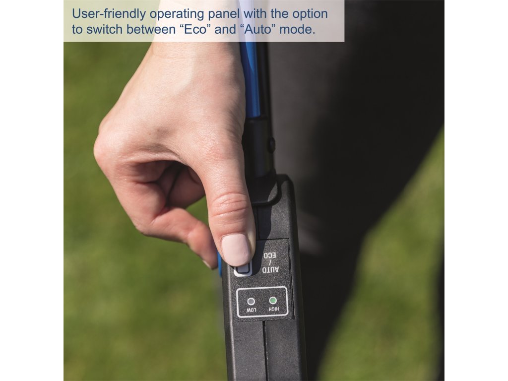Výkonný systém 2x20 V (dohromady 40 V) zajišťuje spolehlivý výkon a efektivní práci. Ideální volba pro zahrady o velikosti 600–700 m2. Praktický ovládací panel umožňuje přepínání mezi režimy „Eco“ a „Auto“. V režimu Eco se nastaví nižší rychlost pro maximální výdrž baterie, zatímco v režimu Auto se rychlost automaticky přizpůsobuje aktuální zátěži. Výšku střihu lze snadno centrálně přizpůsobit v šesti stupních od 25 do 75 mm.