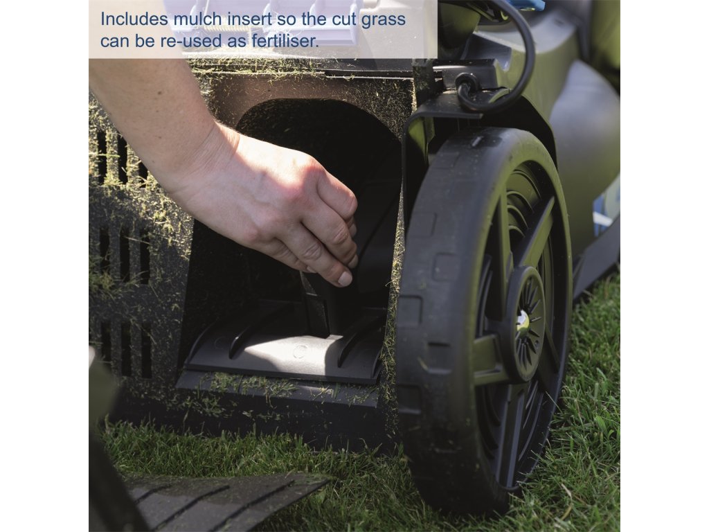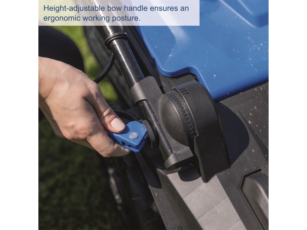 Ergonomické komfortní madlo účinně absorbuje vibrace a přispívá k pohodlné práci. Sběrný koš s kapacitou 50 litrů a indikátorem naplnění minimalizuje nutnost přerušení při údržbě trávníku. Sekačka je vybavena bezpečnostním klíčem a sklopným krytem chránícím baterii. Vysoce odolný nůž ze speciální oceli zaručuje dlouhou životnost. Velká kola šetrná k trávníku poskytují skvělou stabilitu i na svažitých terénech. Sklopné madlo umožňuje snadné a prostorově úsporné skladování. Součástí balení je mulčovací nástavec, který umožňuje efektivní využití posekané trávy jako přírodního hnojiva. Stroj se dodává bez baterie a nabíječky.