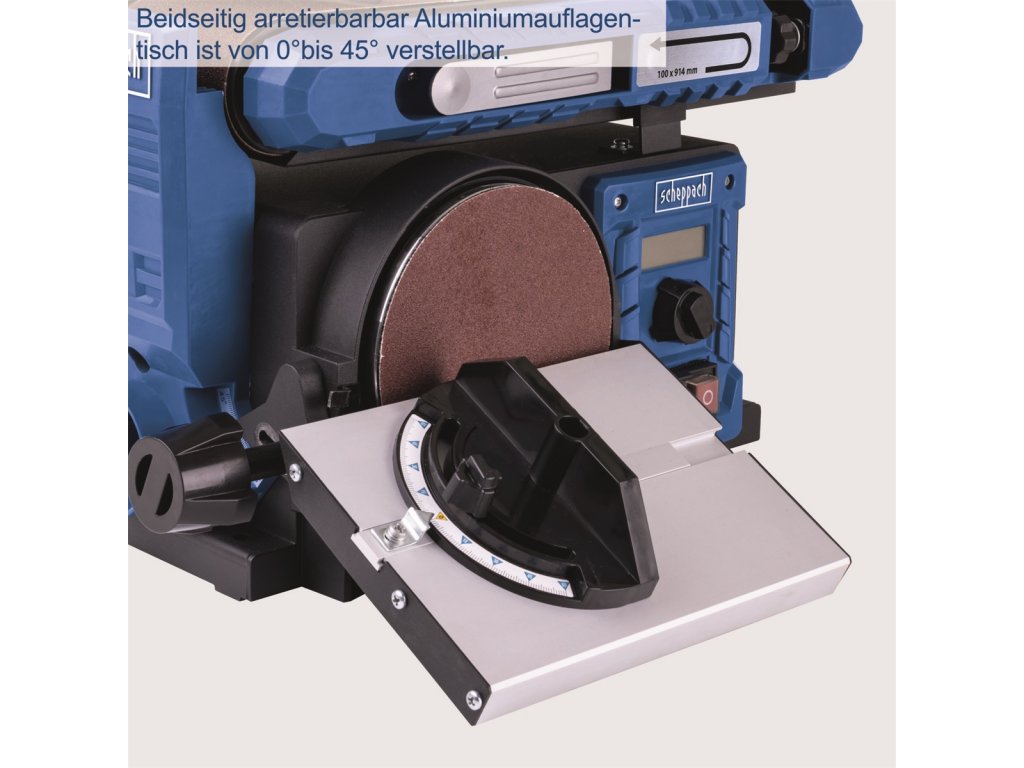 Rychlost je zřetelně čitelná na LCD displeji. Další výhodou celé brusky je její variabilita. Celá jednotka s brusným pásem se může naklopit o 90° z horizontální až do vertikální polohy. Přídavný stolek s úhlovým pravítkem se může sklopit a zajistit v rozmezí 0° až 45°. Na rozdíl od mnoha podobných brusek na trhu je kotoučová bruska integrována do těla stroje takovým způsobem, že nebrání práci ani s velkými obrobky.