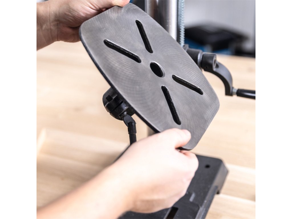 Silný 750W indukční motor poskytuje dostatek výkonu i pro náročnější úkoly a zajišťuje plynulý chod bez vibrací. Masivní litinová konstrukce se sloupem o průměru 65 mm zajišťuje vysokou stabilitu, zatímco velký pracovní stůl 240 × 240 mm nabízí dostatek prostoru i pro větší obrobky. Stůl lze otáčet o 360°, plynule výškově nastavovat a naklápět až o ±45°, což výrazně zvyšuje variabilitu práce.