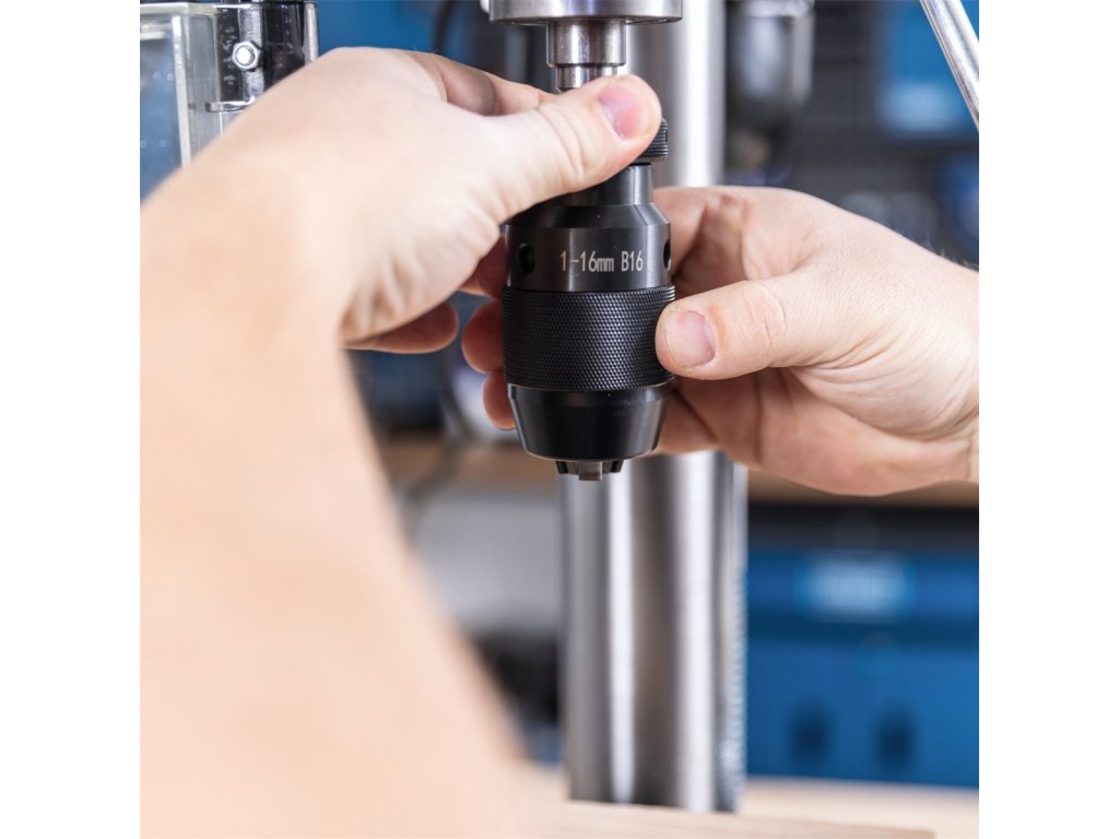 Kvalitní rychloupínací sklíčidlo s kuličkovými ložisky a ochranným krytem pojme vrtáky od 1 do 16 mm. Nastavitelný doraz hloubky zaručuje jednotné výsledky i při sériovém vrtání. Díky velkému výkyvu 152 mm lze opracovávat obrobky o průměru až 304 mm. Pevná základna umožňuje bezpečné uchycení vrtačky k pracovnímu stolu a ergonomická pogumovaná rukojeť zajišťuje pohodlné ovládání i při delší práci.