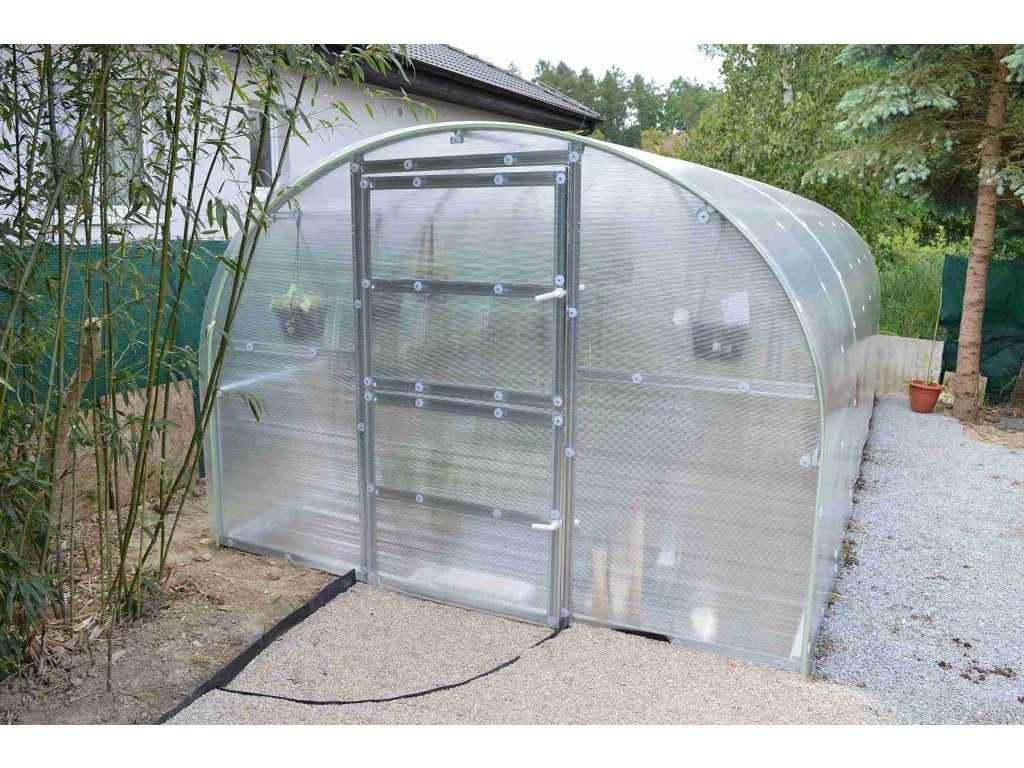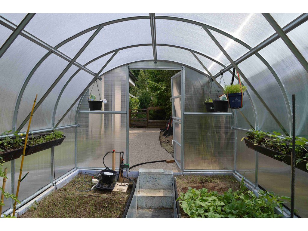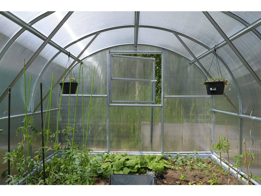 obloukový skleník LANITPLAST TIBERUS | pozinkovaný ocelový profil 1mm, rozteč oblouků 100 cm, dvojité dveře vpředu, ventilační okno vzadu, prosklení nutno vyřezat z dodaných polykarbonátových desek, možnost montáže střešního okna - ano |