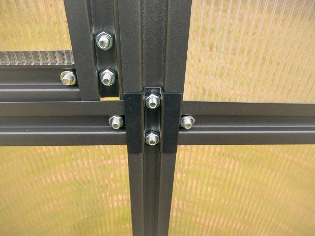 Robustní konstrukce skleníku se skládá z 1 mm tlustých ocelových profilů s galvanickým pokovením a finálním UV ochranným lakem, což zajišťuje maximální odolnost proti vnějším vlivům, včetně deště, větru a slunce, čímž se značně prodlužuje jeho životnost a skleník vám tak poslouží po dlouhé roky. Prosklení je tvořeno ze 4,5 mm polykarbonátu s ochranou proti UV záření. Tyto desky jsou nejen odolné, ale také přispívají ke zlepšení přirozeného osvětlení uvnitř skleníku, což má pozitivní vliv na růst a zdraví pěstovaných rostlin.