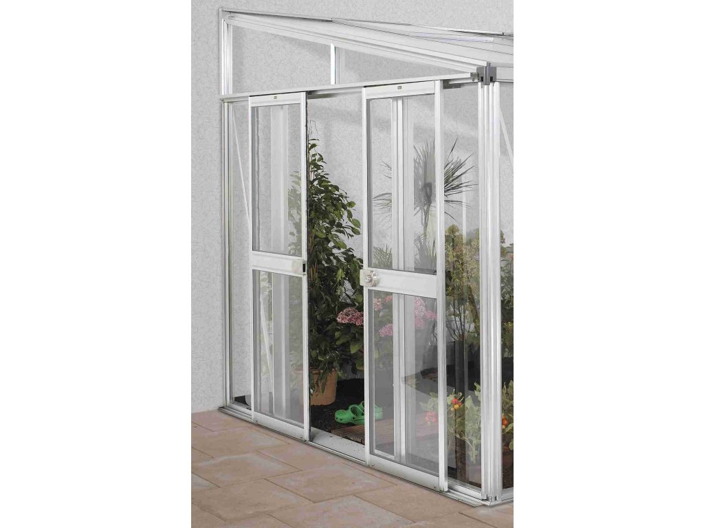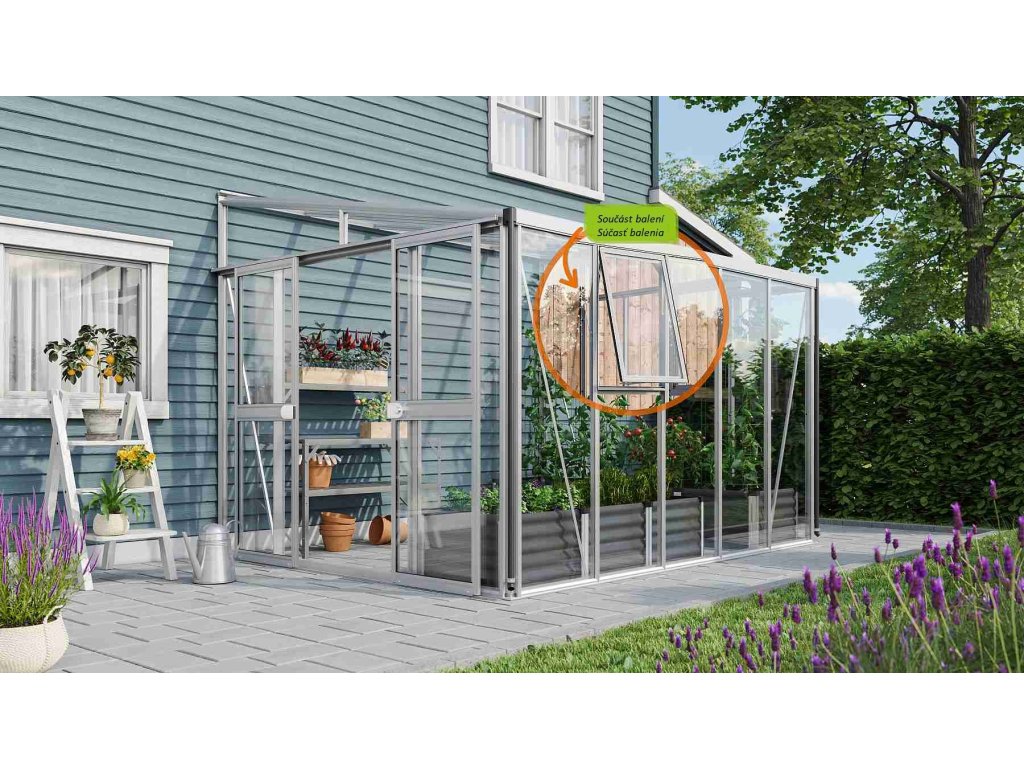 Obsahem balení jsou dvoukřídlé posuvné dveře (š x v otvoru = 1,19 x 1,77 m), AL profily, prosklení, 2x boční ventilační okénko s manuálním otevíráním, 1x okapový žlab včetně dvou svodů, 1x cylindrický zámek a veškerý spojovací materiál. Ke skleníku je možné dokoupit řadu nadstandardního příslušenství - poličky, regály, další větrací střešní i boční okénka, automatické otvírače k těmto okénkům, teploměry, vlhkoměry, zavlažovací zařízení, elektrické odporové vytápění půdy.