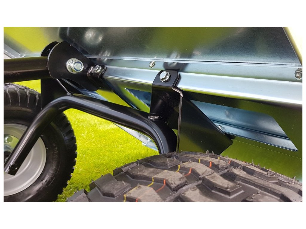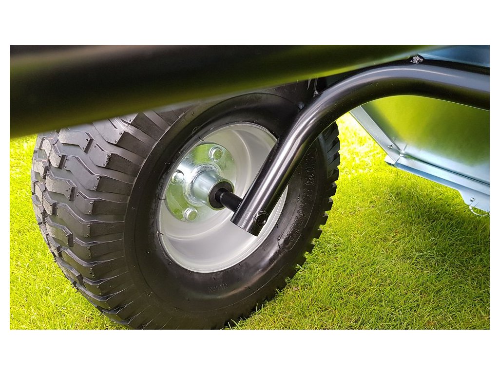 - Vozíky jsou dodávány se sestavenou nápravou, rychlá montáž kol na čtyři šrouby. Dezén pneumatik šetrný k trávníku.
