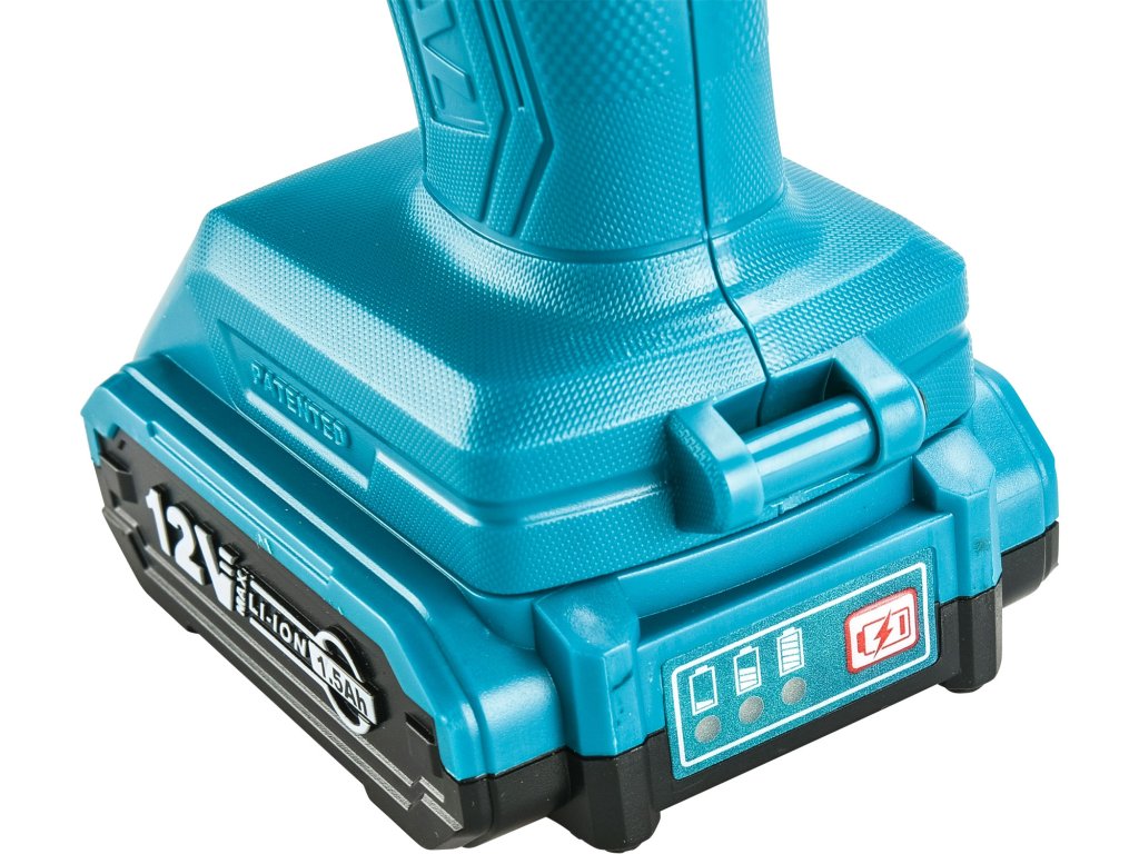 Srdcem této sady nářadí je 12 V vrtací šroubovák AKU dodávaný s nabíječkou a 1ks baterie.