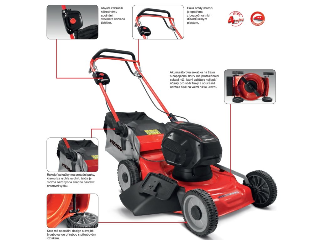 Tyto poslední funkce se používají převážně na přerostlou trávu. Kola je ze speciální pryže jsou uložena v oboustraných kuličkových ložiscích, centrální nastavení výšky sečení je u značky WEIBANG také samozřejmostí.