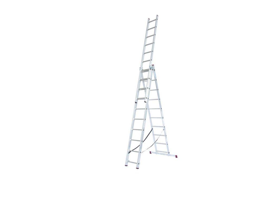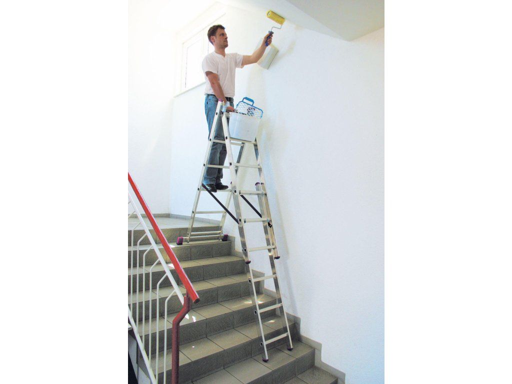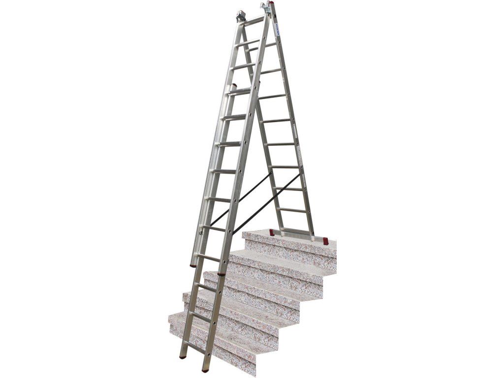Trojdílný mnohoúčelový hliníkový žebřík, který lze díky unikátní konstrukci kromě běžného použití (opěrný žebřík, štafle a výsuvný žebřík) využít i na schodištích či jiných víceúrovňových površích.
