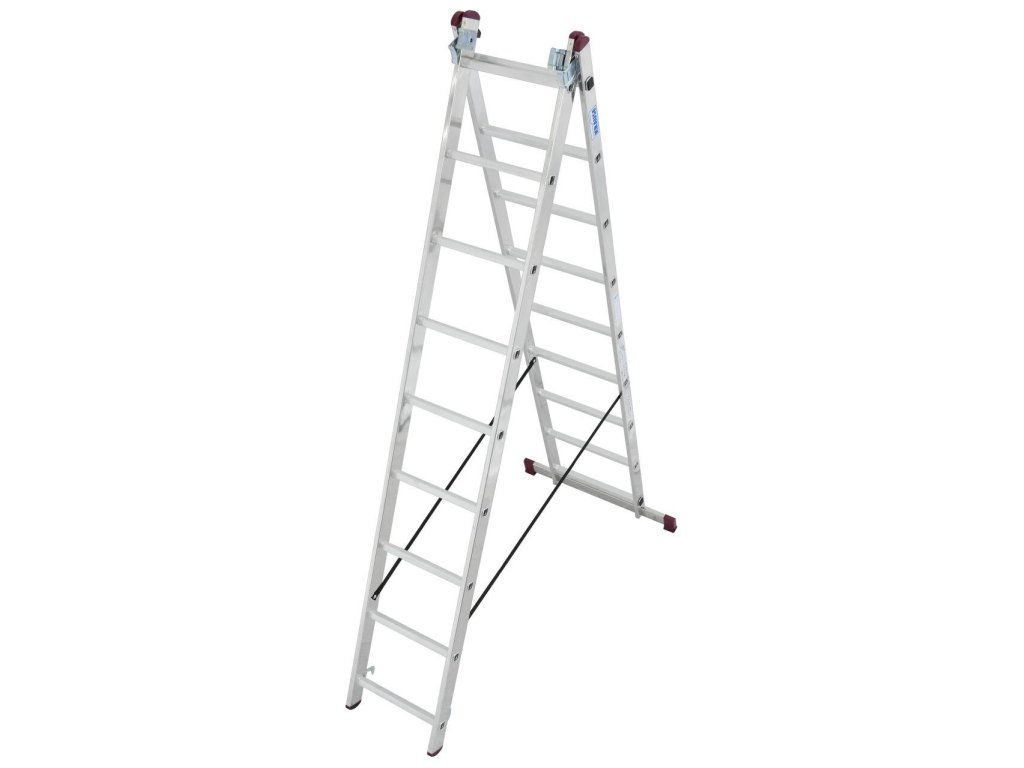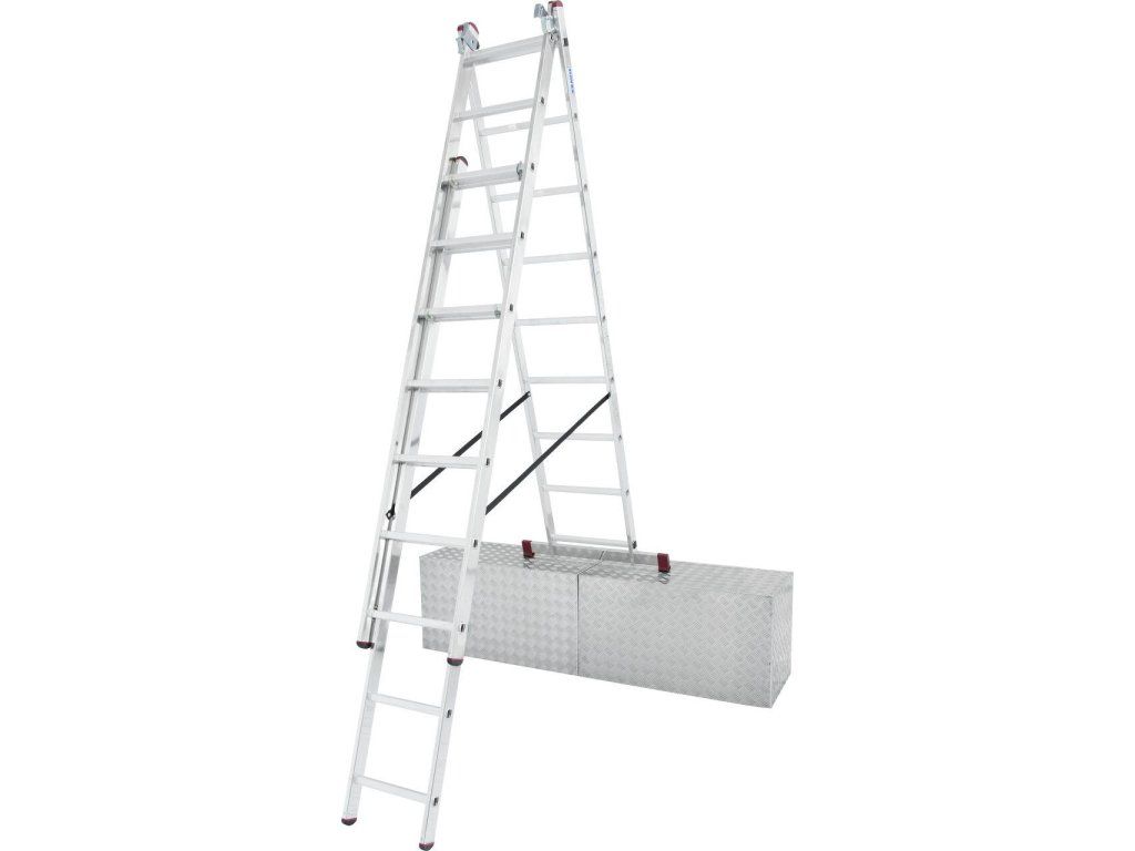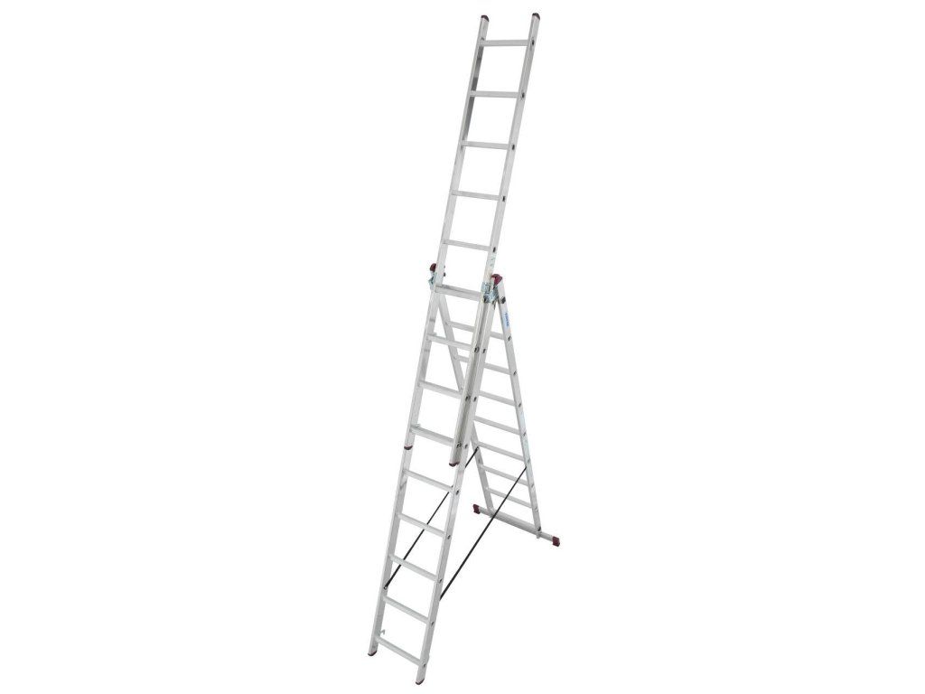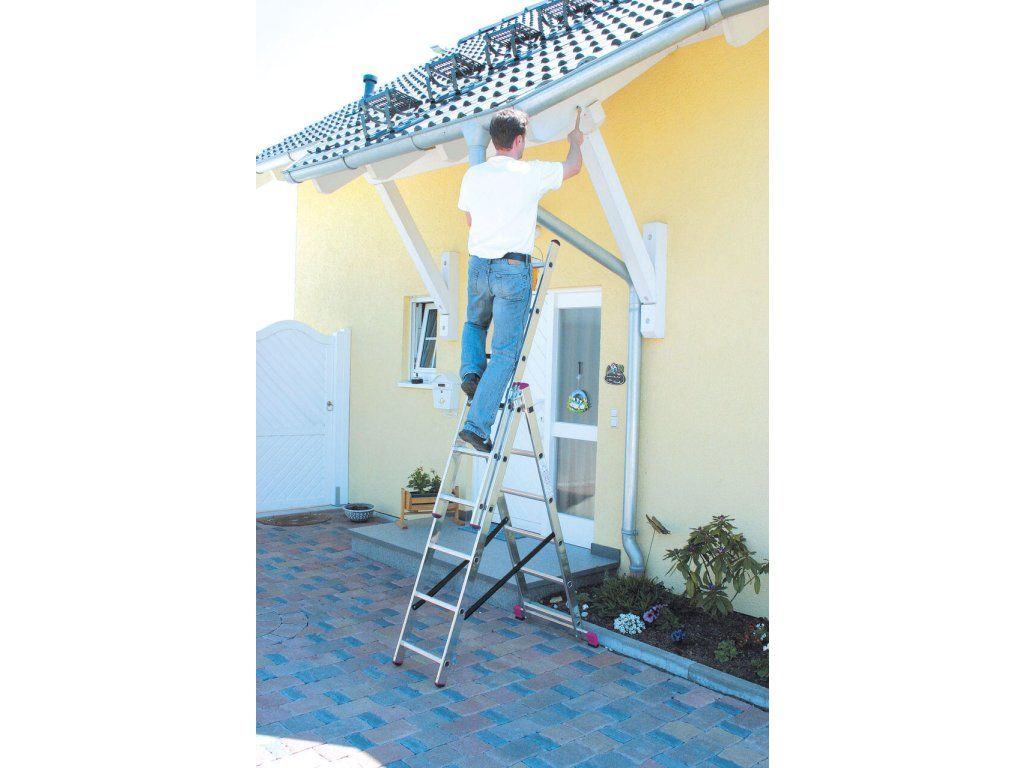 Trojdílný mnohoúčelový hliníkový žebřík, který lze díky unikátní konstrukci kromě běžného použití (opěrný žebřík, štafle a výsuvný žebřík) využít i na schodištích či jiných víceúrovňových površích.